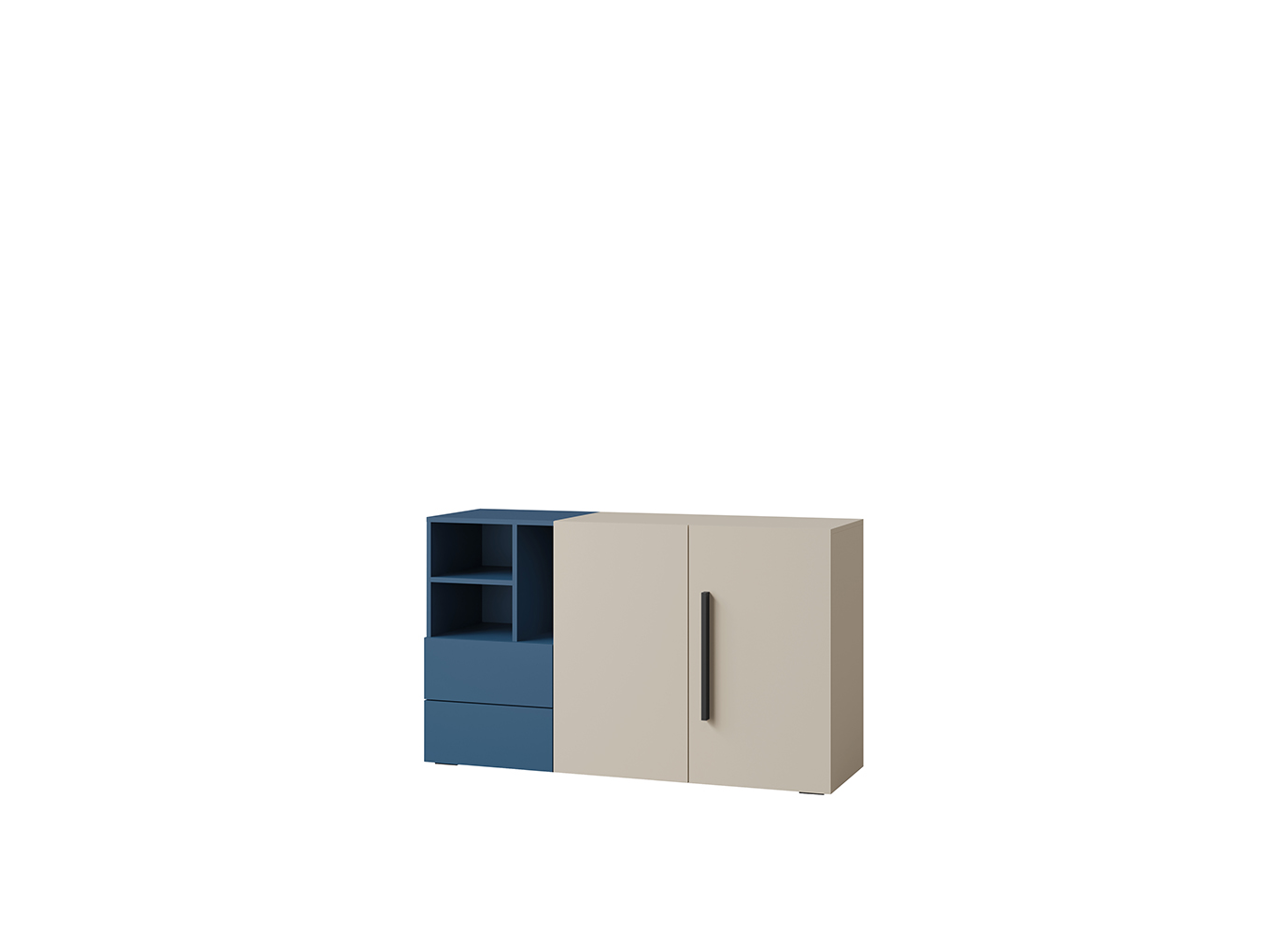Nowoczesna komoda w eleganckim połączeniu kolorów błękit oraz kaszmir. Funkcjonalny układ półek, szuflad i zamykanej części sprawia, że mebel świetnie sprawdzi w pokoju młodzieżowym.