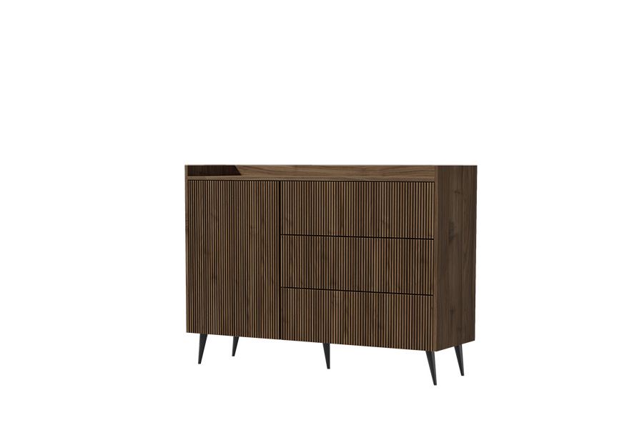Komoda ADEMO 4 to nowoczesny mebel o ponadczasowym designie, który doskonale łączy funkcjonalność z elegancją. Jej wyjątkowe, pionowo frezowane fronty w kolorze ciemnego orzecha oraz czarne, metalowe nóżki tworzą stylowy i spójny wygląd.