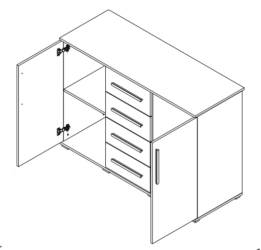 wewnątrz komody: półka za drzwiczkami, na środku 4 szuflady