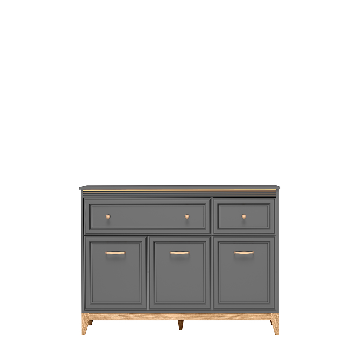 Subtelne frezowane fronty, uchwyty w kolorze różowego złota oraz drewniane nóżki nadają bryłom lekkości i stylowego charakteru.