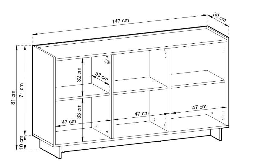 Komoda posiada 3 otwierane drzwiczki (wewnątrz półki):