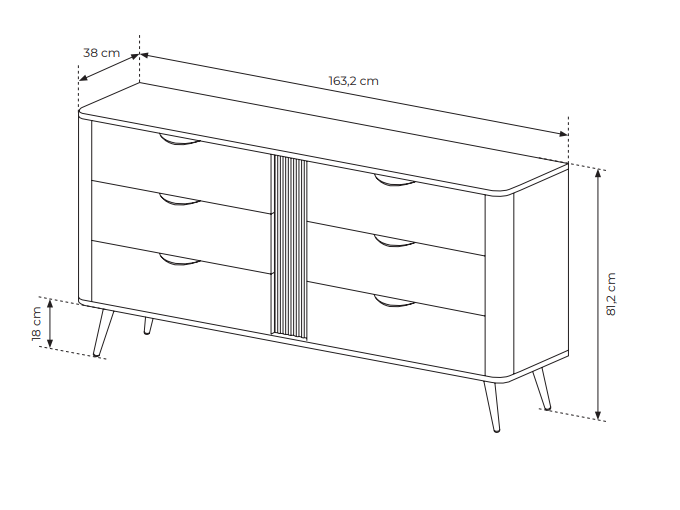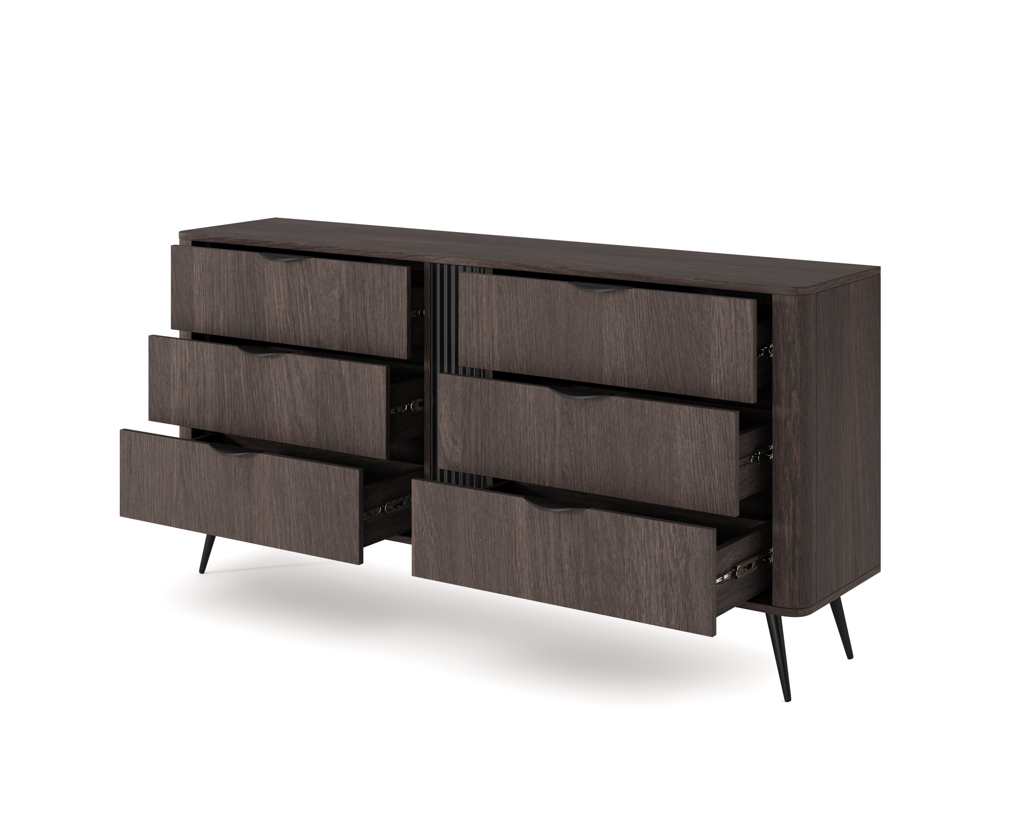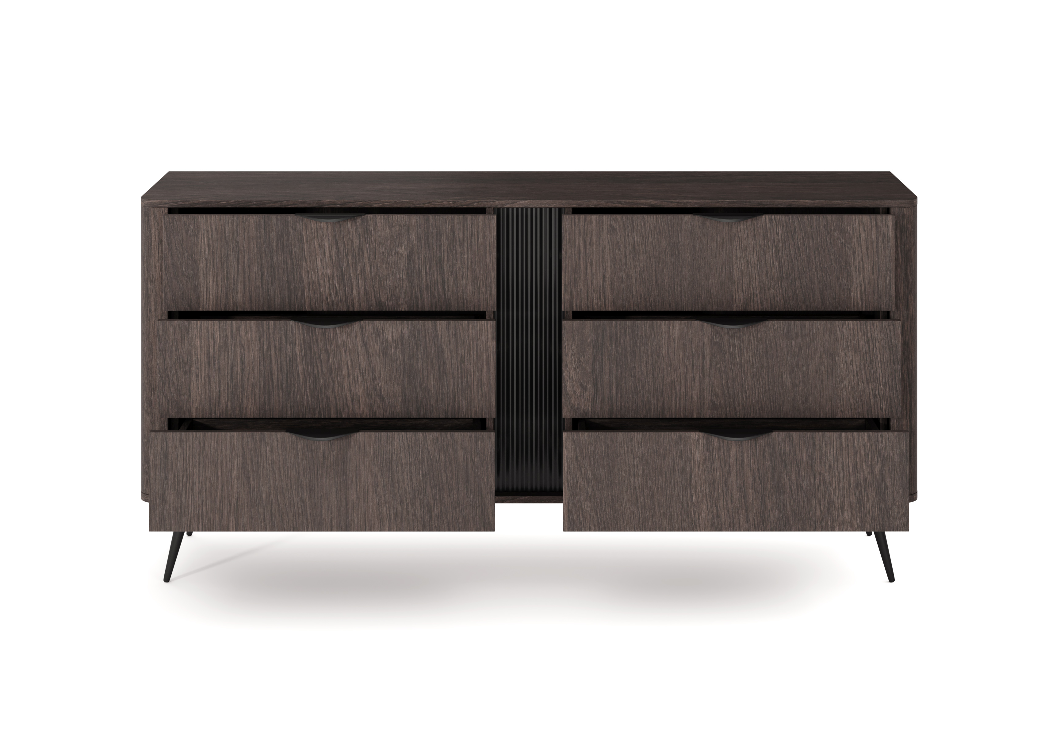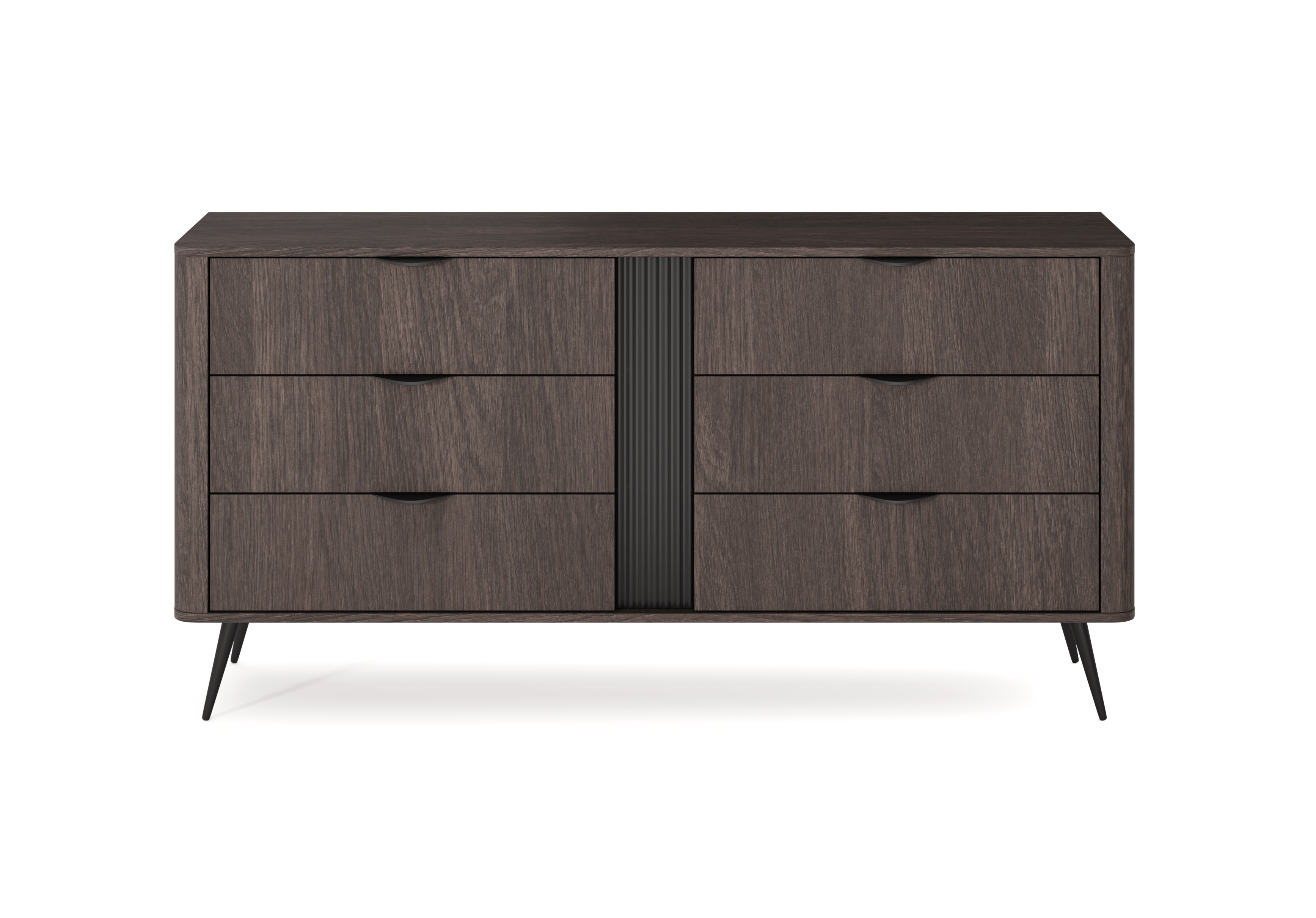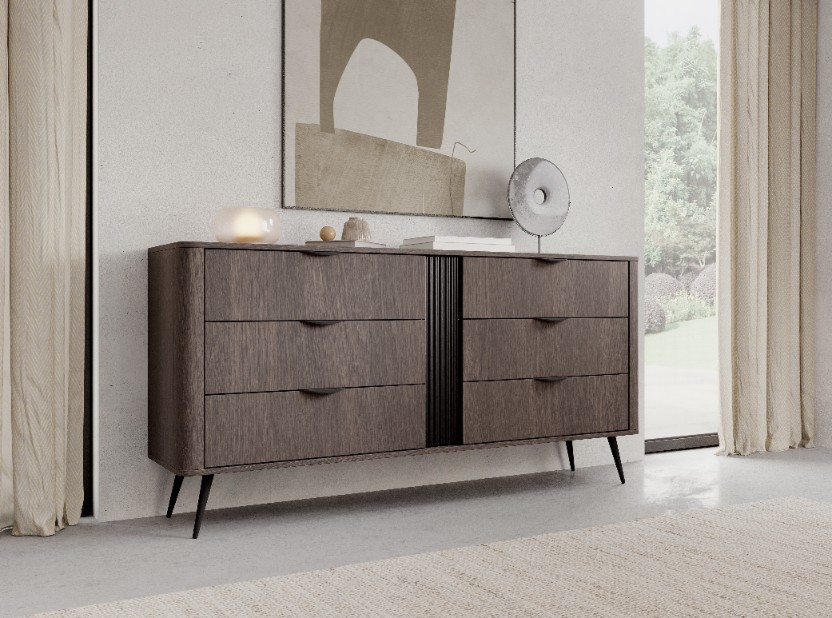 Charakterystyczne dla tej serii są zaokrąglone listwy na bokach oraz czarne akcenty, które nadają meblom wyjątkowego charakteru.