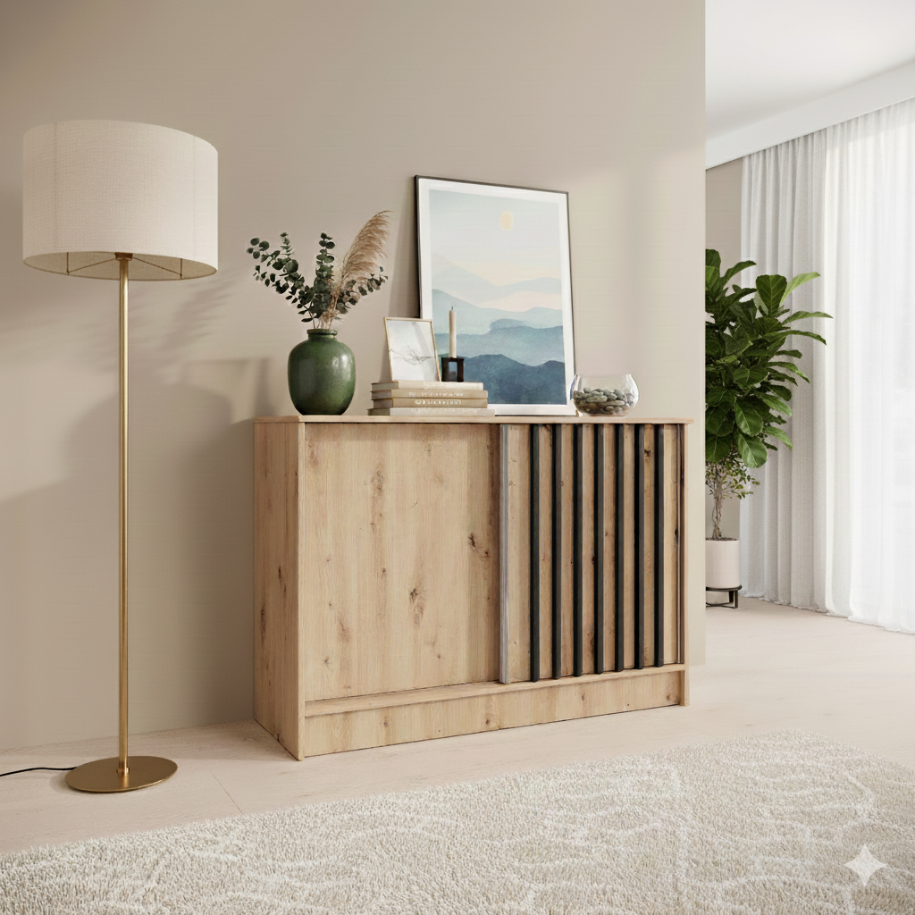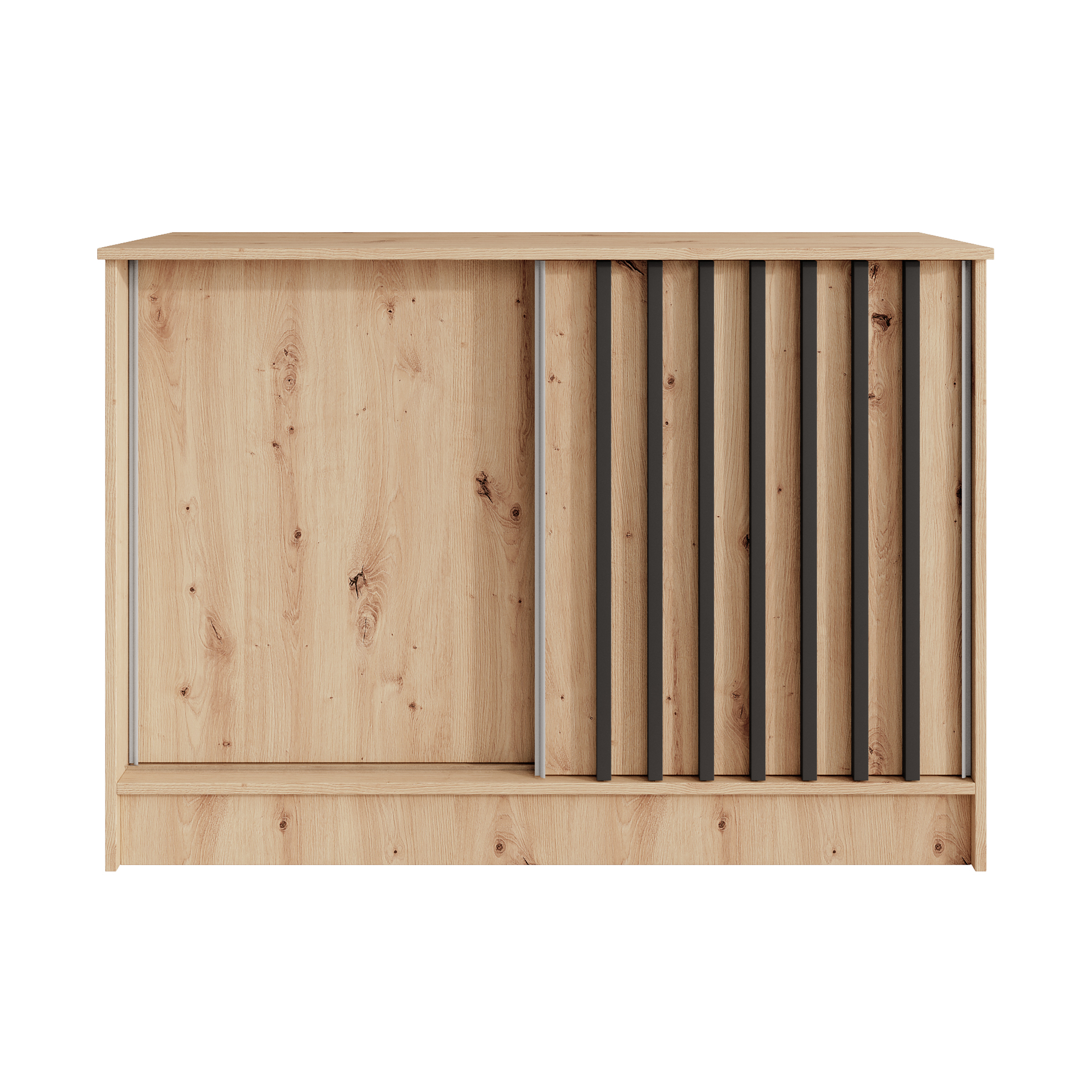 Komoda przesuwna 121 cm dąb artisan + czarne lamele LAM