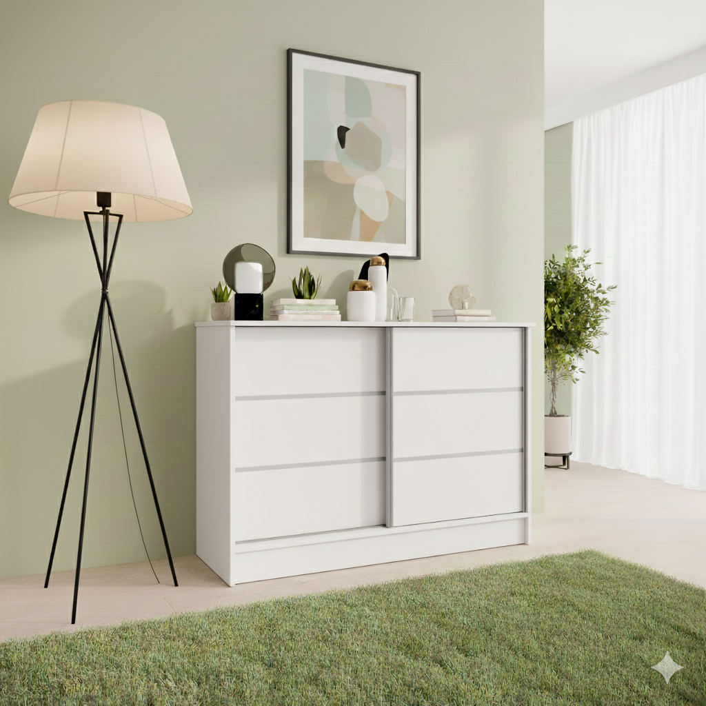 Komoda przesuwna ze szprosami 121 cm biała K120