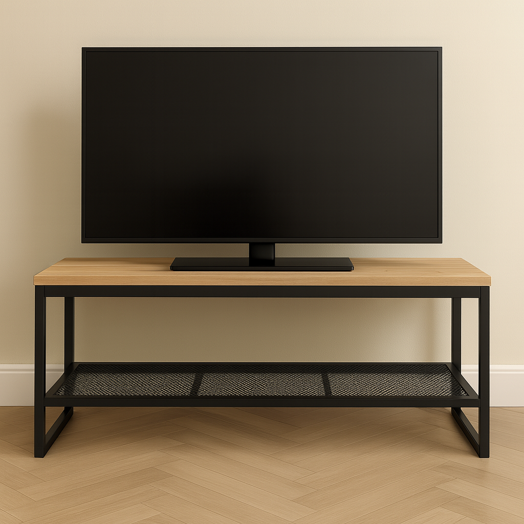 Nowoczesna i funkcjonalna szafka RTV, która świetnie sprawdzi się w salonie, sypialni czy pokoju dziennym. Połączenie białego blatu z czarnym, metalowym stelażem nadaje całości eleganckiego, loftowego charakteru.