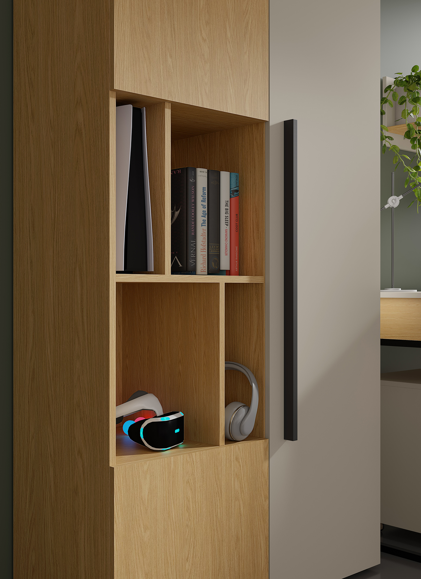 - Otwarte półki – na dekoracje, książki lub akcesoria