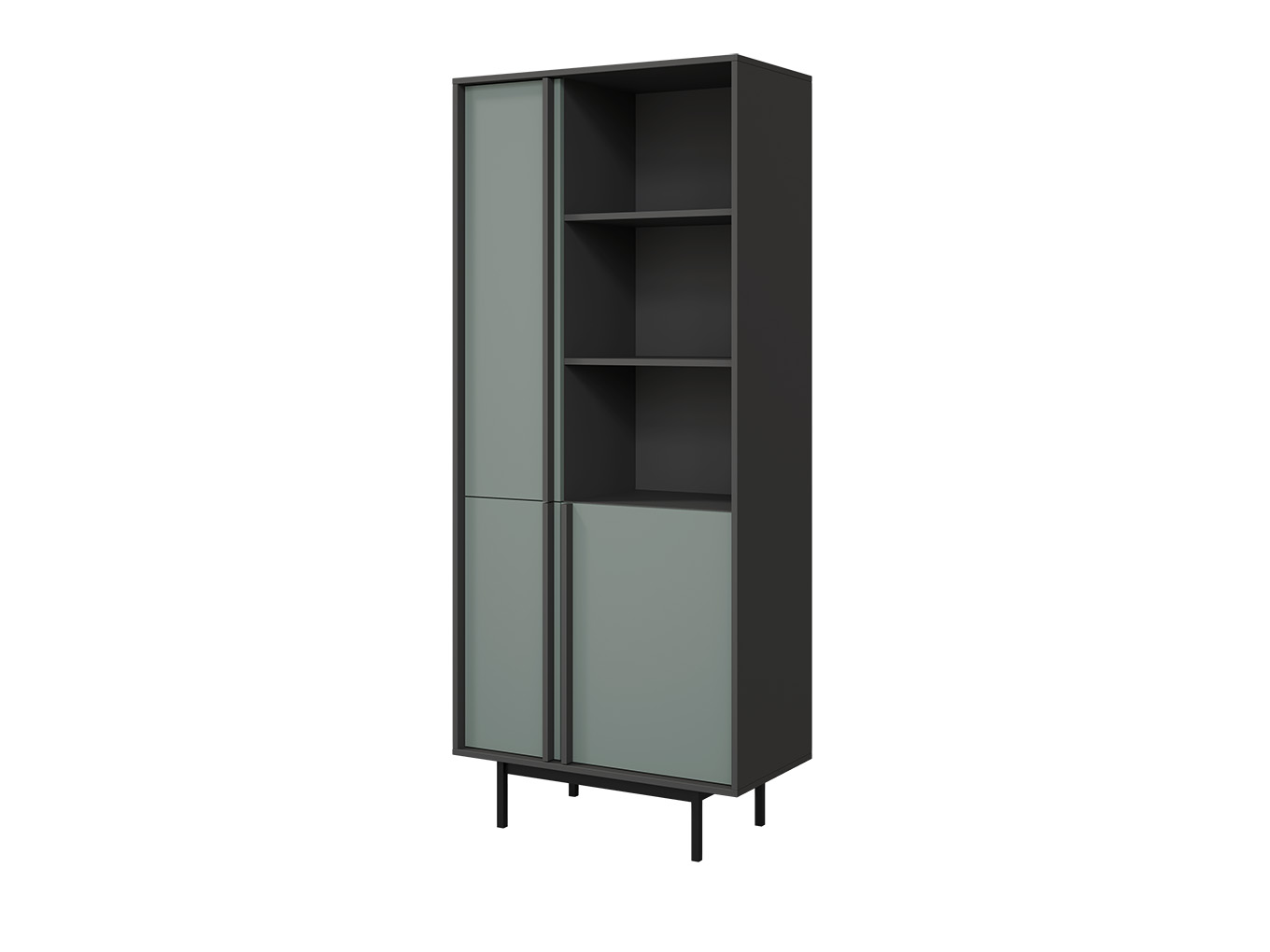 Nowoczesny regał z zamykanymi frontami to idealne połączenie stylu i praktyczności. Modne zestawienie aloesowej zieleni z eleganckim grafitem sprawia, że mebel doskonale wpisuje się w aranżacje typu loft, nowoczesne i minimalistyczne.