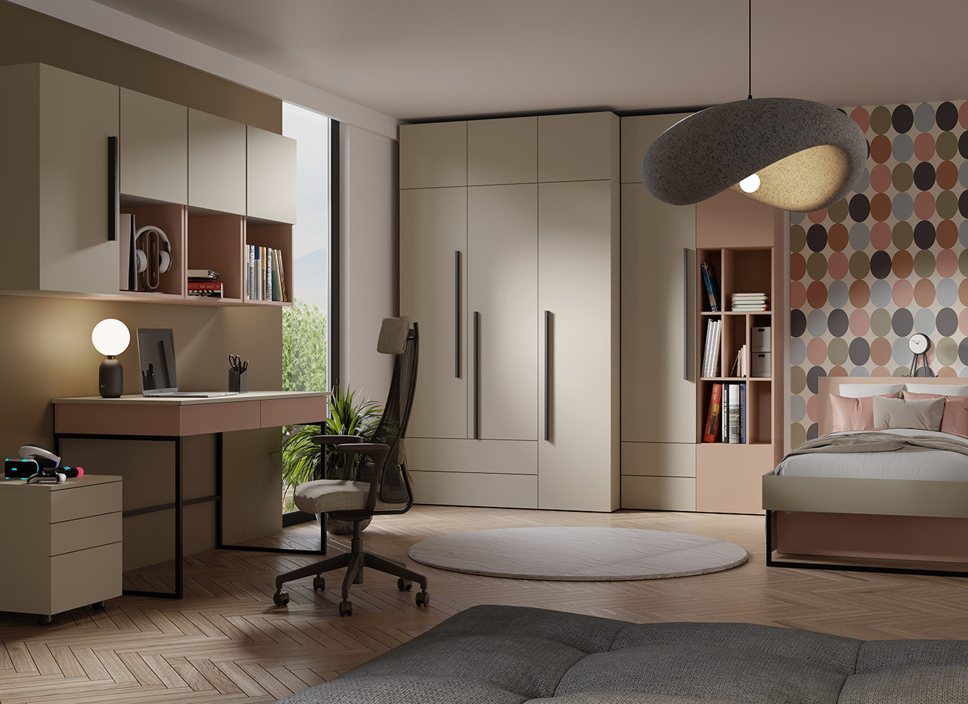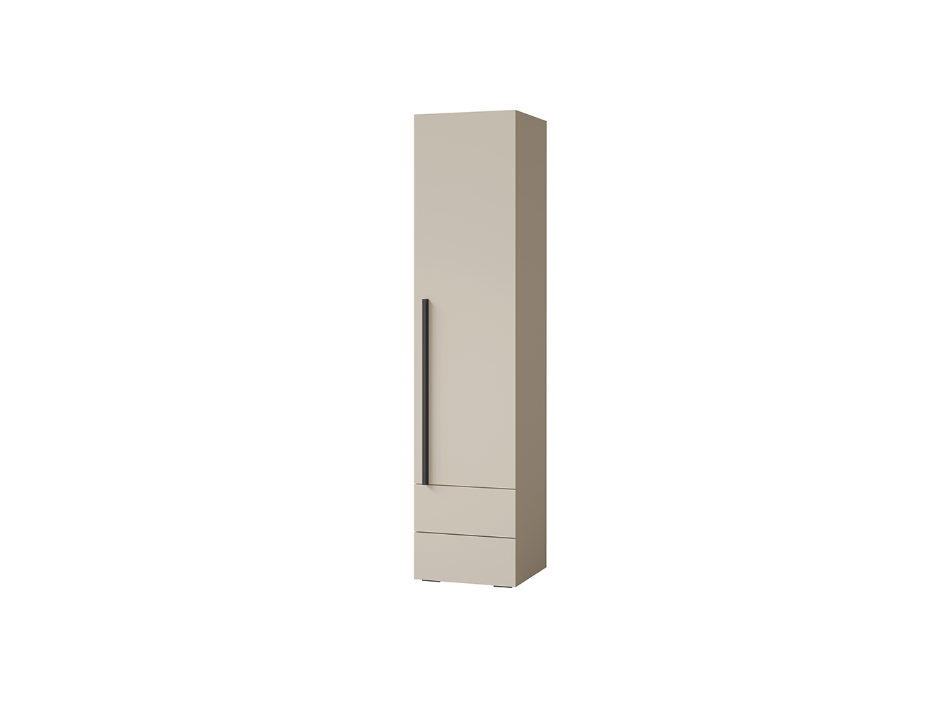 Nowoczesna szafa jednodrzwiowa typu słupek w modnym kolorze kaszmir. Dzięki swojej wąskiej konstrukcji świetnie sprawdzi się w mniejszych pomieszczeniach, gdzie liczy się funkcjonalne wykorzystanie przestrzeni. Minimalistyczny wygląd oraz elegancki czarny uchwyt nadają meblowi nowoczesny charakter.