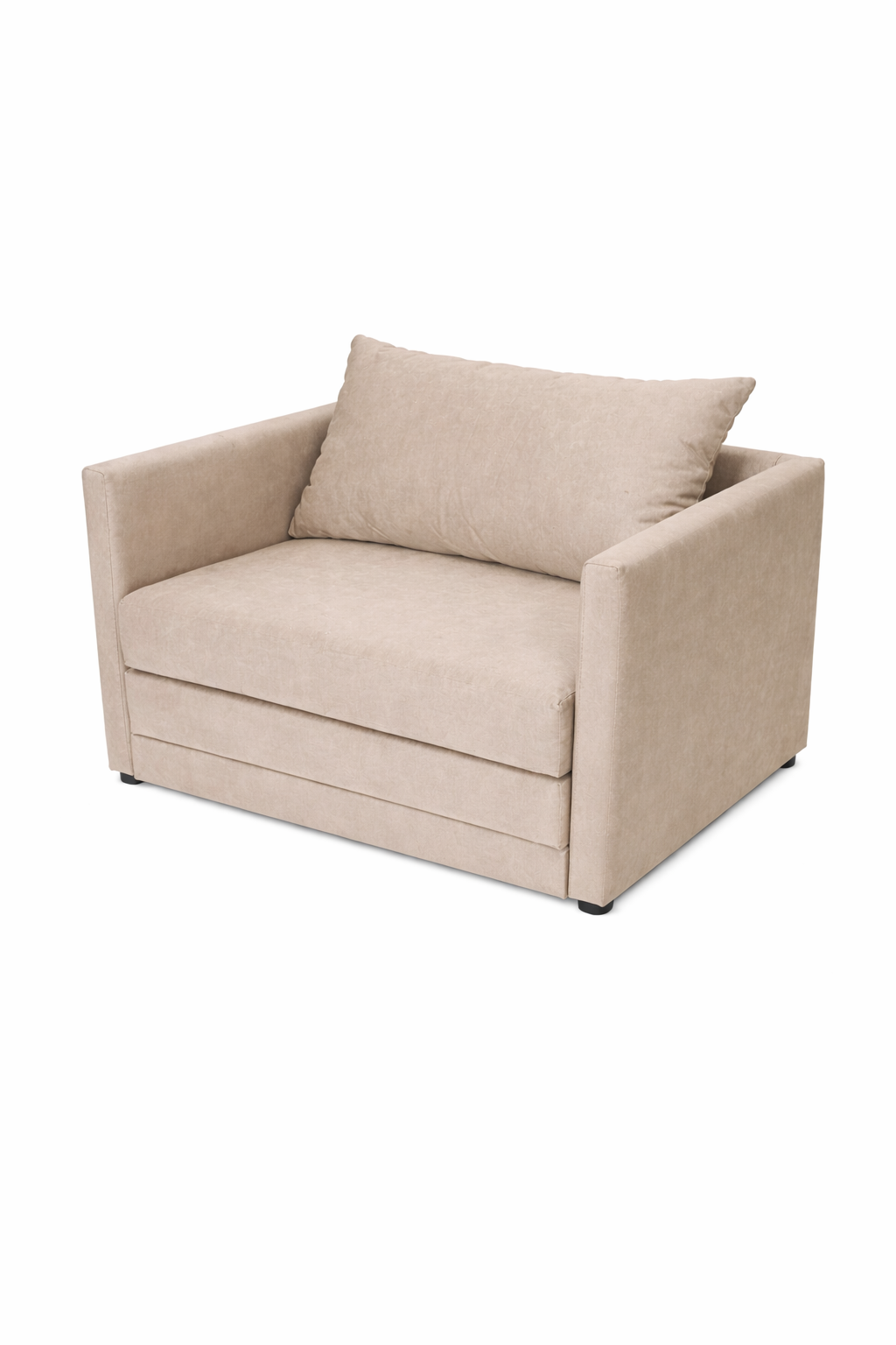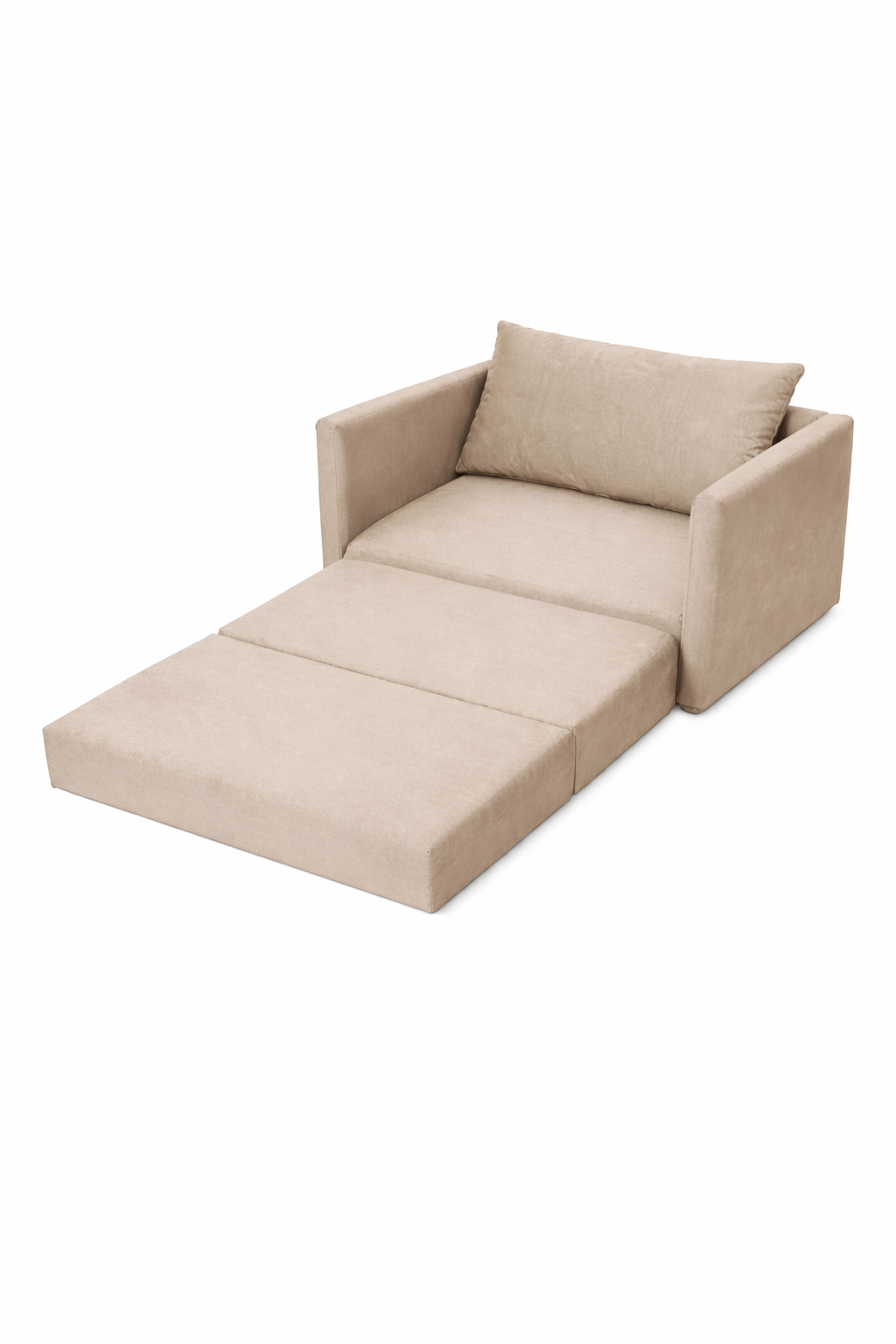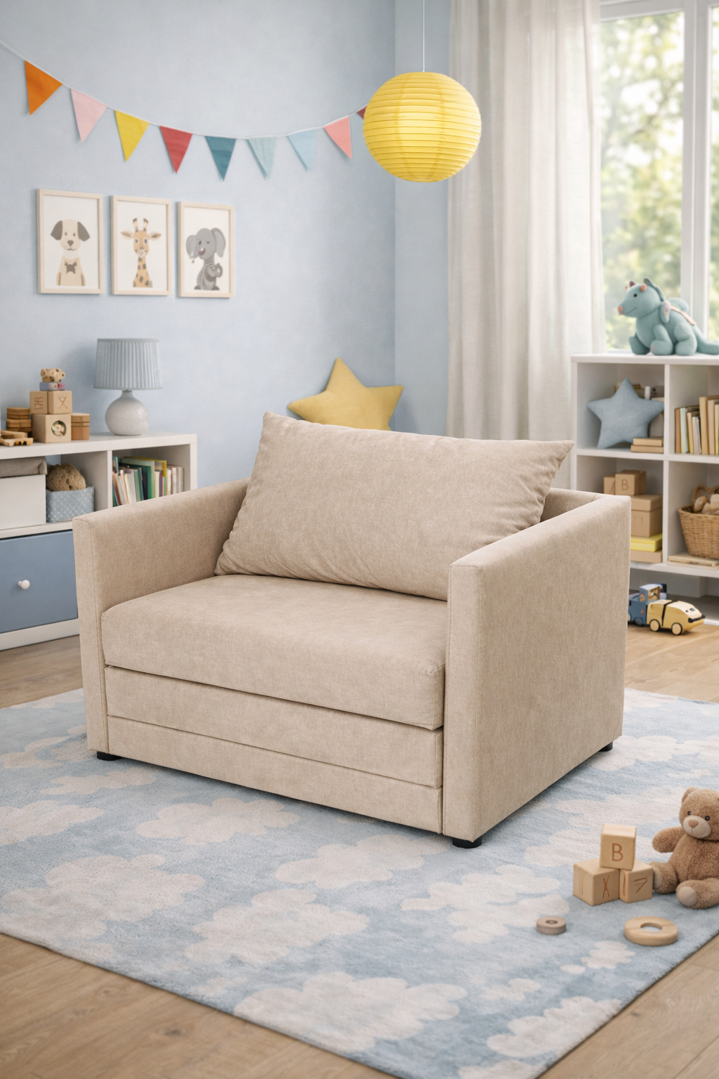 Nowoczesny fotel rozkładany w eleganckiej, beżowej tapicerce. W kilka chwil zmienia się w wygodne miejsce do spania. Idealny do małych mieszkań, pokoju gościnnego lub młodzieżowego. Prosta forma, solidne wykonanie i miękkie siedzisko zapewniają komfort zarówno w dzień, jak i w nocy.