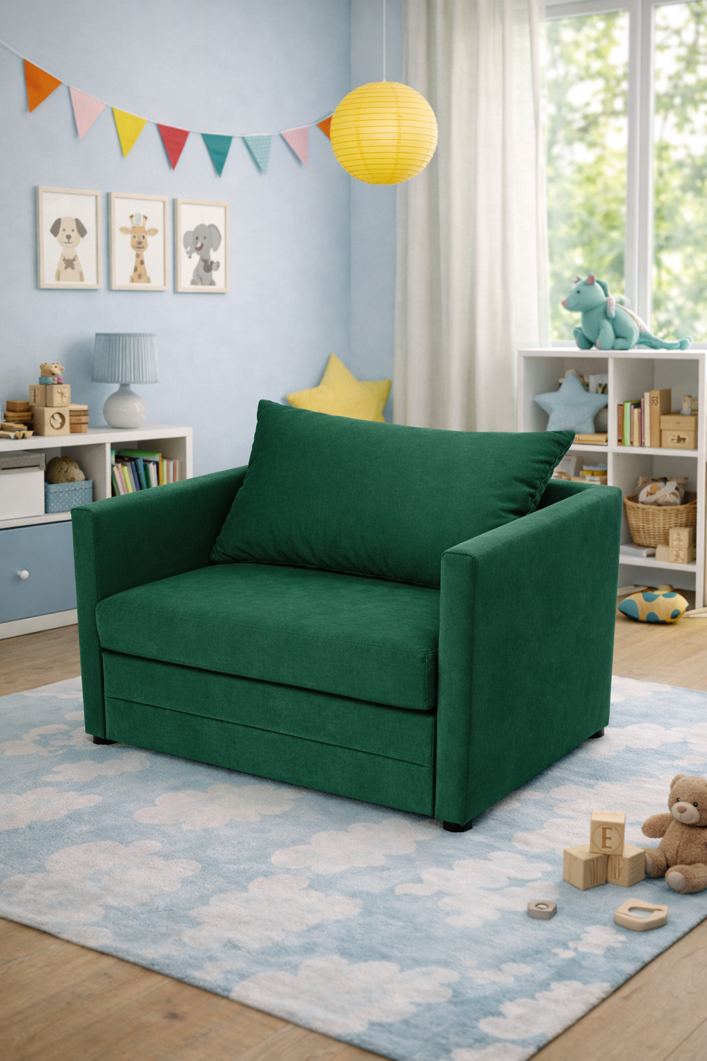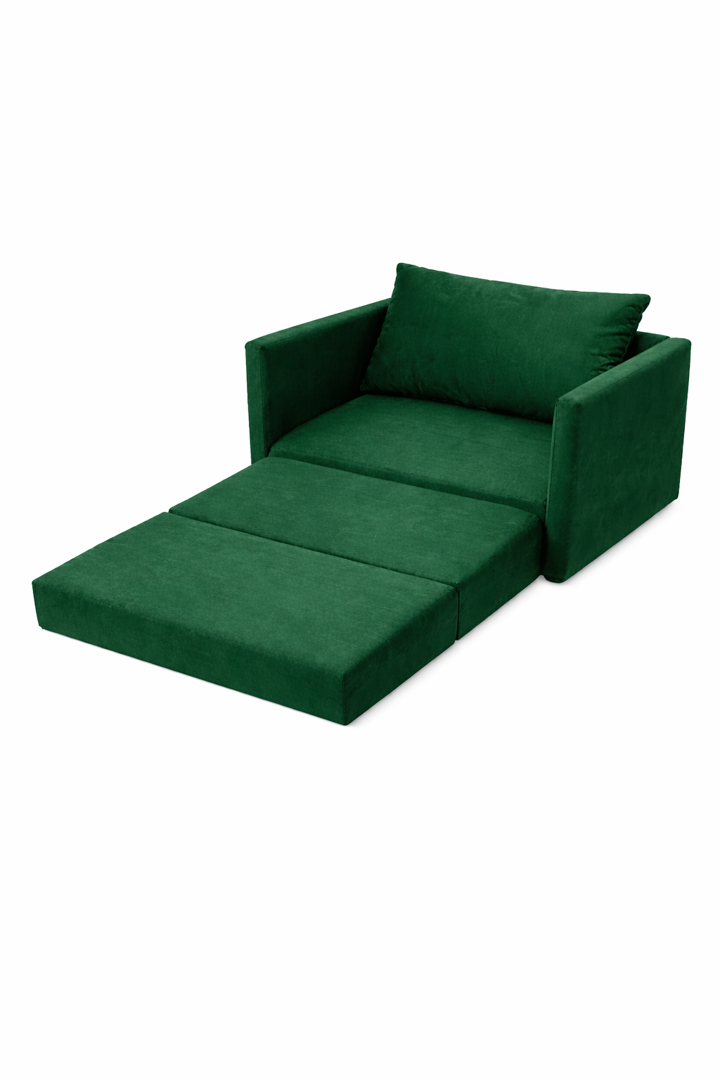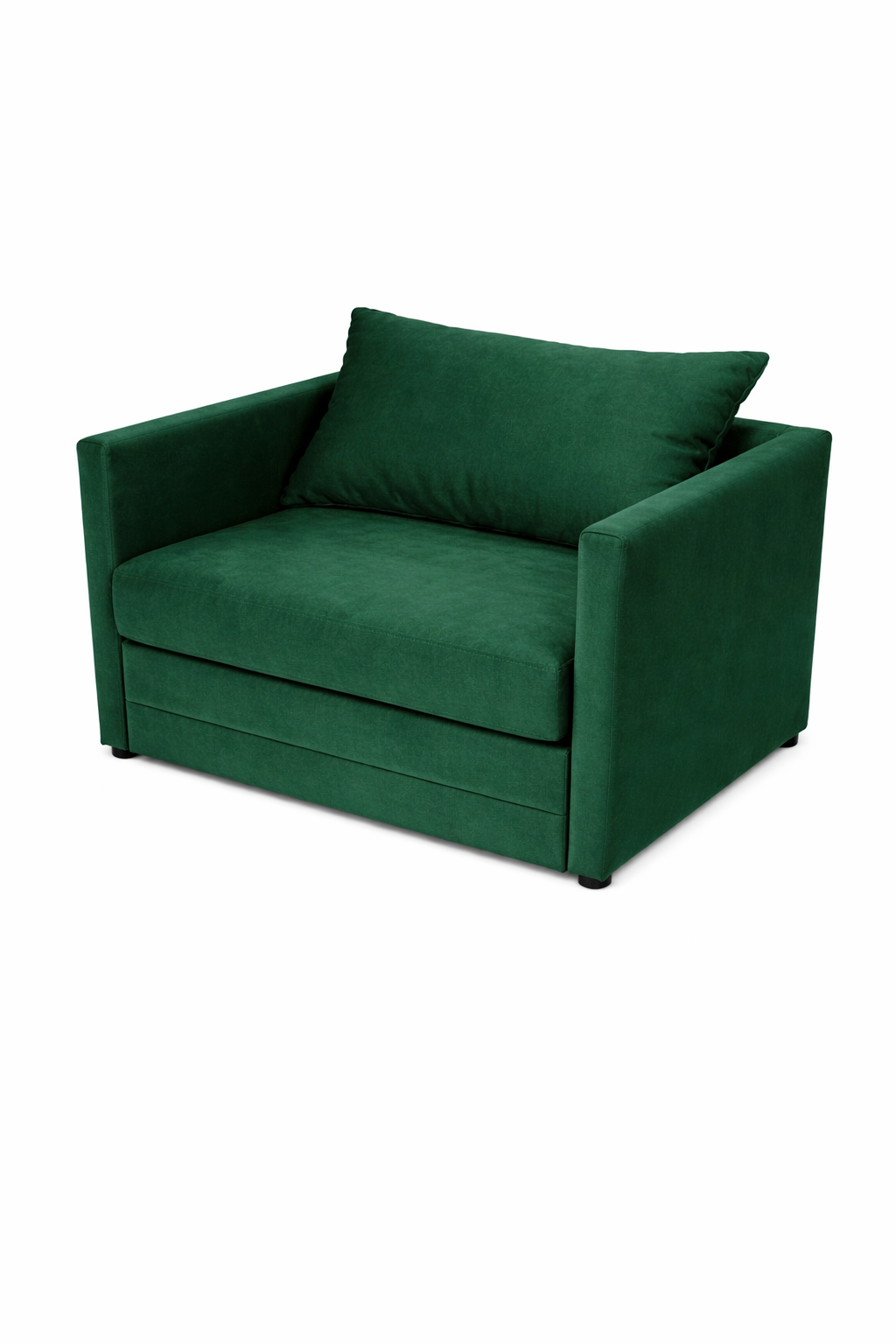 Nowoczesny fotel rozkładany w eleganckiej, butelkowej zieleni – tapicerce. W kilka chwil zmienia się w wygodne miejsce do spania. Idealny do małych mieszkań, pokoju gościnnego lub młodzieżowego. Prosta forma, solidne wykonanie i miękkie siedzisko zapewniają komfort zarówno w dzień, jak i w nocy.