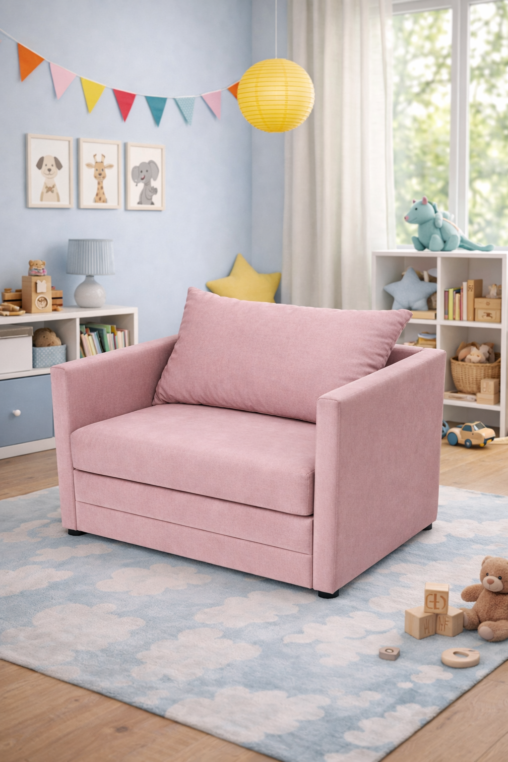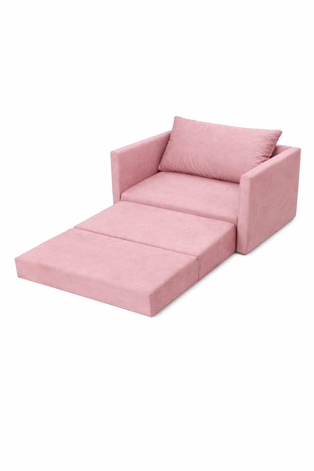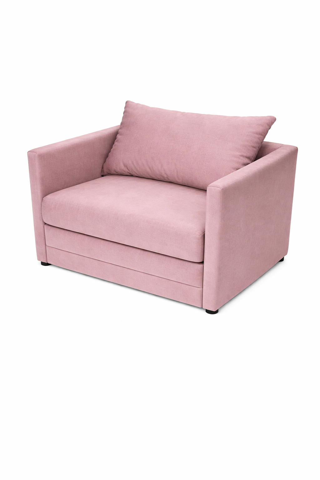 Nowoczesny fotel rozkładany w eleganckiej, różowej tapicerce. W kilka chwil zmienia się w wygodne miejsce do spania. Idealny do małych mieszkań, pokoju gościnnego lub młodzieżowego. Prosta forma, solidne wykonanie i miękkie siedzisko zapewniają komfort zarówno w dzień, jak i w nocy.