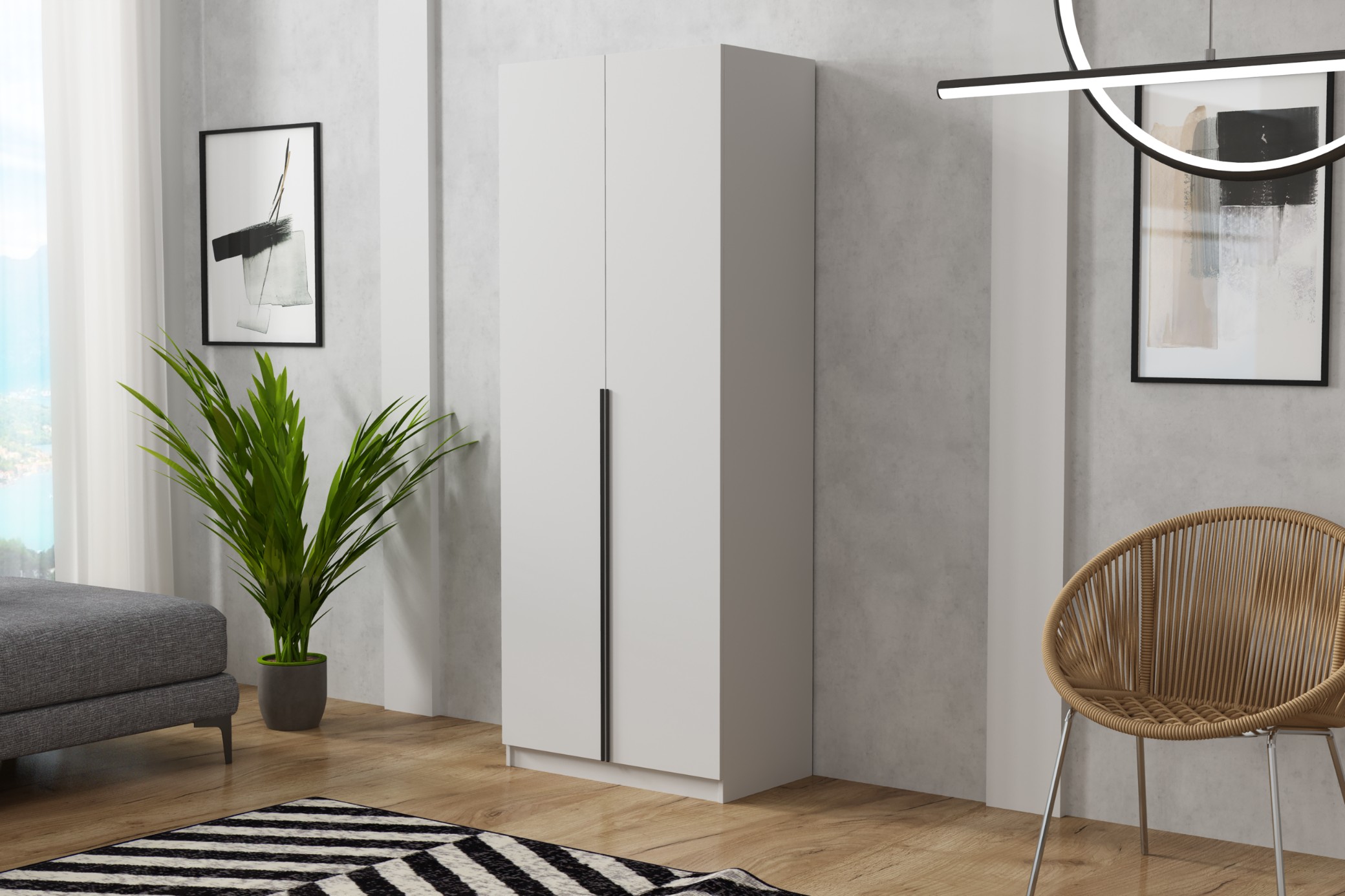 Praktyczna i elegancka szafa dwudrzwiowa o szerokości 90 cm, która doskonale sprawdzi się w sypialni, garderobie, przedpokoju lub pokoju młodzieżowym. Prosty, minimalistyczny design oraz uniwersalny biały kolor sprawiają, że mebel łatwo dopasuje się do różnych aranżacji wnętrz.