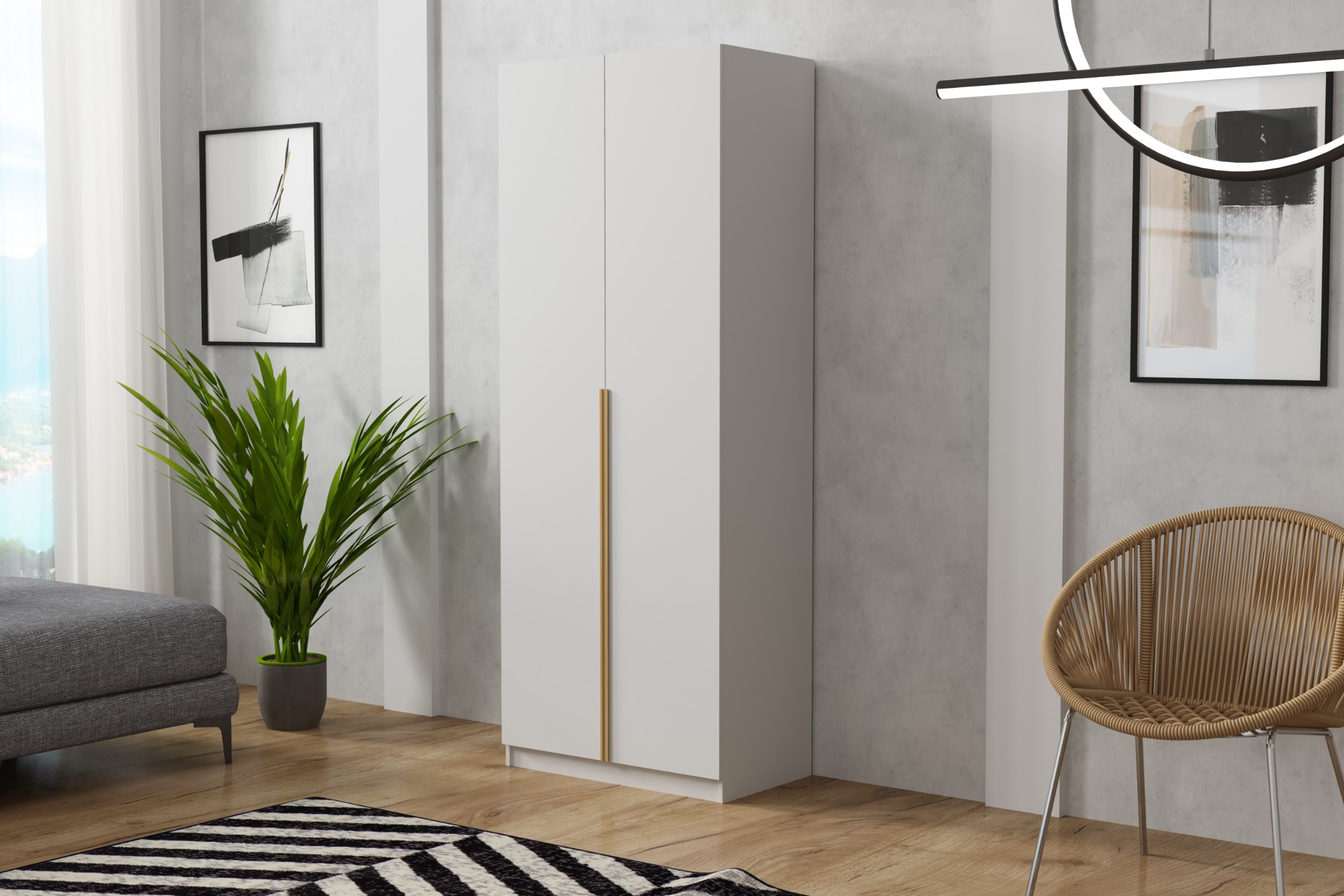 Praktyczna i elegancka szafa dwudrzwiowa o szerokości 90 cm, która doskonale sprawdzi się w sypialni, garderobie, przedpokoju lub pokoju młodzieżowym. Prosty, minimalistyczny design oraz uniwersalny biały kolor sprawiają, że mebel łatwo dopasuje się do różnych aranżacji wnętrz.
