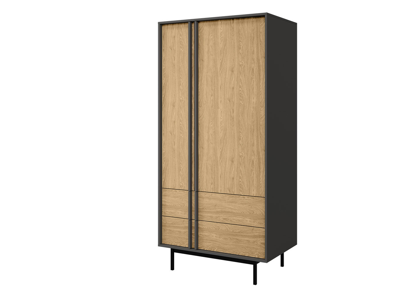 Nowoczesna szafa o minimalistycznym designie, idealna do współczesnych wnętrz. Korpus w kolorze antracyt zestawiony został z frontami w modnym odcieniu dębu, co nadaje meblowi elegancki, a jednocześnie świeży charakter.
