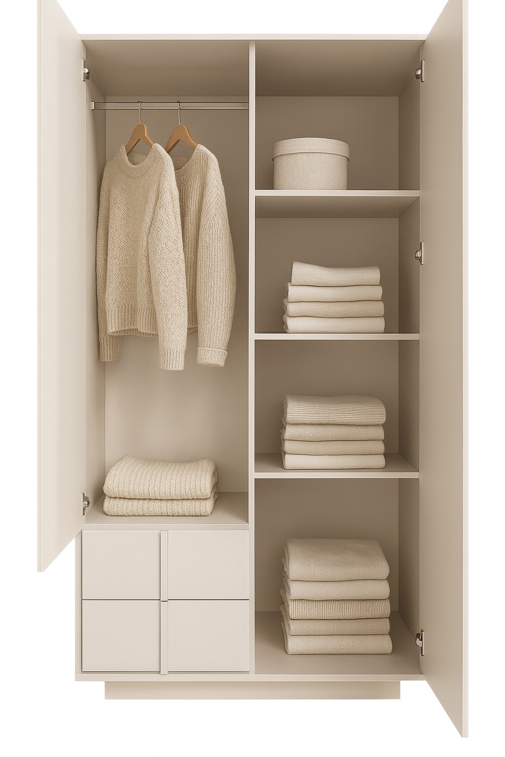 Drzwi otwierane na zawiasach z cichym domykiem zapewniają komfort użytkowania, a przemyślany układ wnętrza umożliwia wygodne przechowywanie ubrań i dodatków. Wewnątrz znajdują się pojemne półki, przestrzeń z drążkiem na wieszaki oraz dolne szuflady.