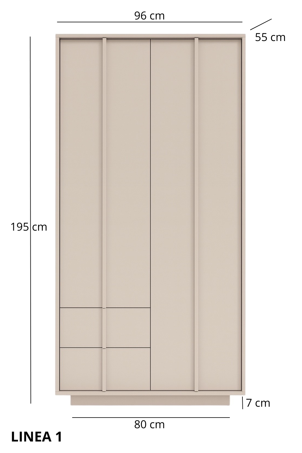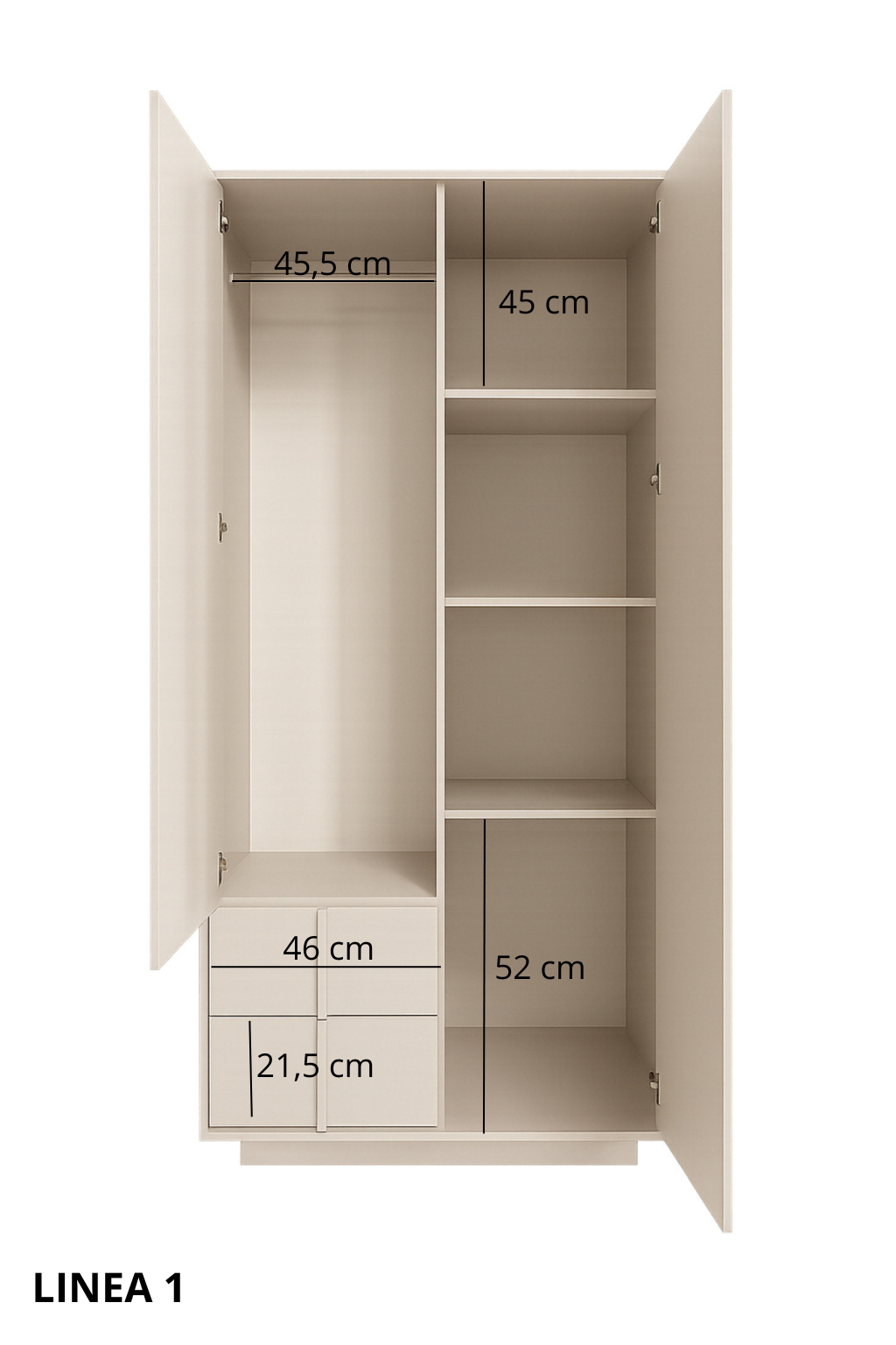 Szafa LINEA to połączenie nowoczesnego designu i praktycznej funkcjonalności. Jej minimalistyczna forma oraz gładkie, pionowe linie na frontach nadają wnętrzu elegancki, harmonijny wygląd. Idealnie sprawdzi się zarówno w sypialni, garderobie, jak i w przedpokoju.