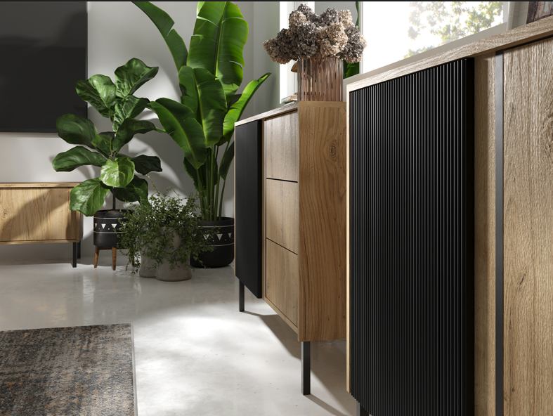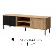 - szafka RTV wykonana z płyty laminowanej w kolorze dąb odwieczny + czarny,