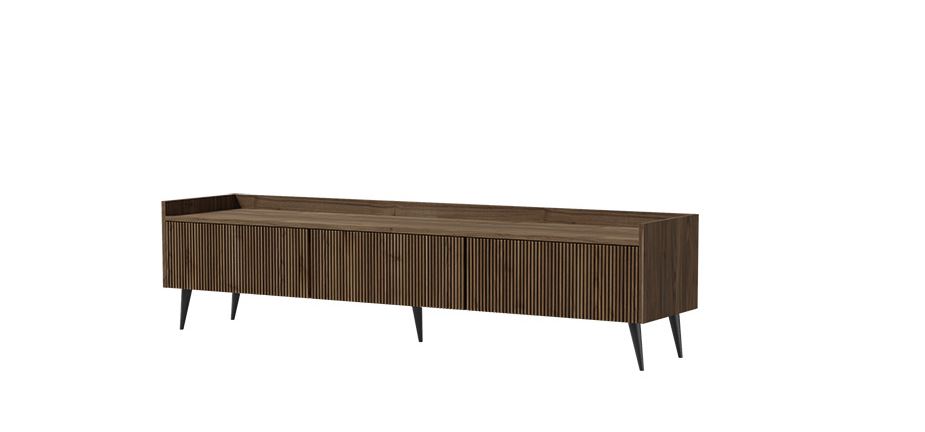 Szafka RTV ADEMO 5 to idealne połączenie stylu i funkcjonalności. Jej wyjątkowe fronty z pionowym frezowaniem w kolorze ciemnego orzecha nadają wnętrzu przytulny, a jednocześnie nowoczesny charakter.