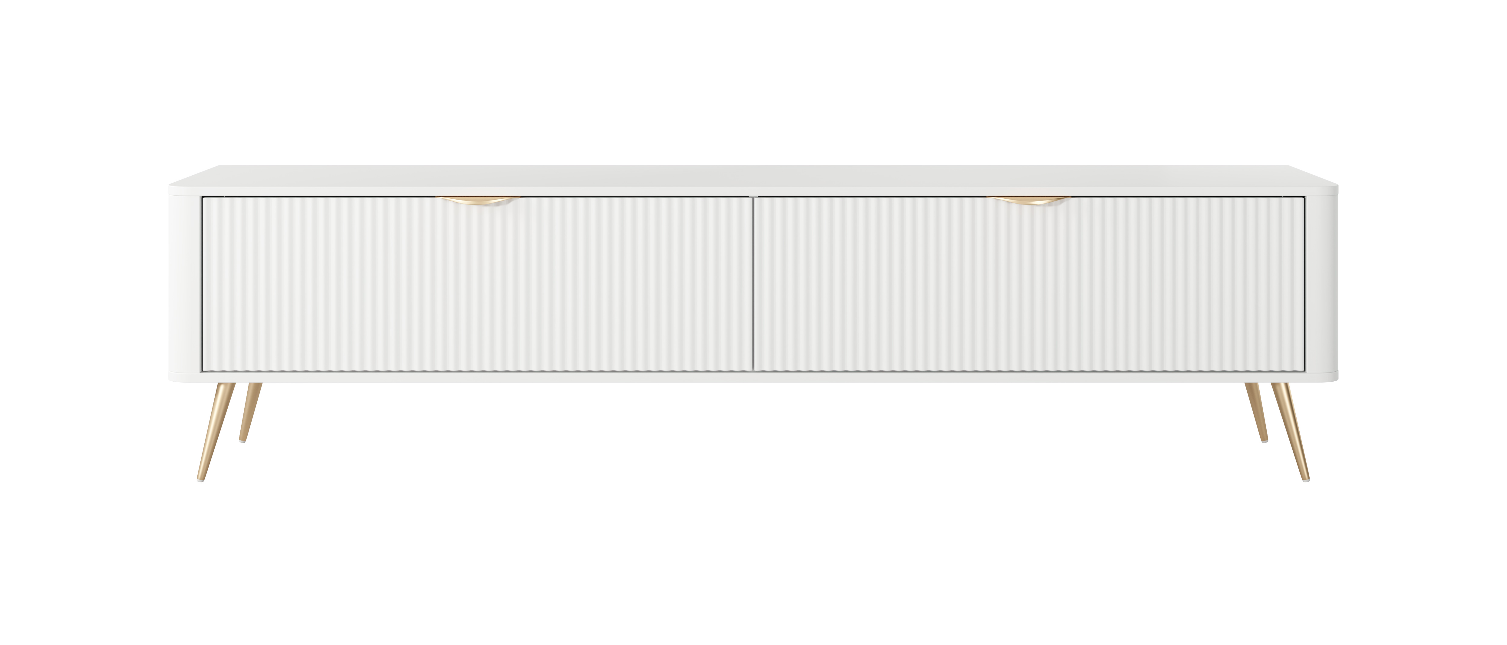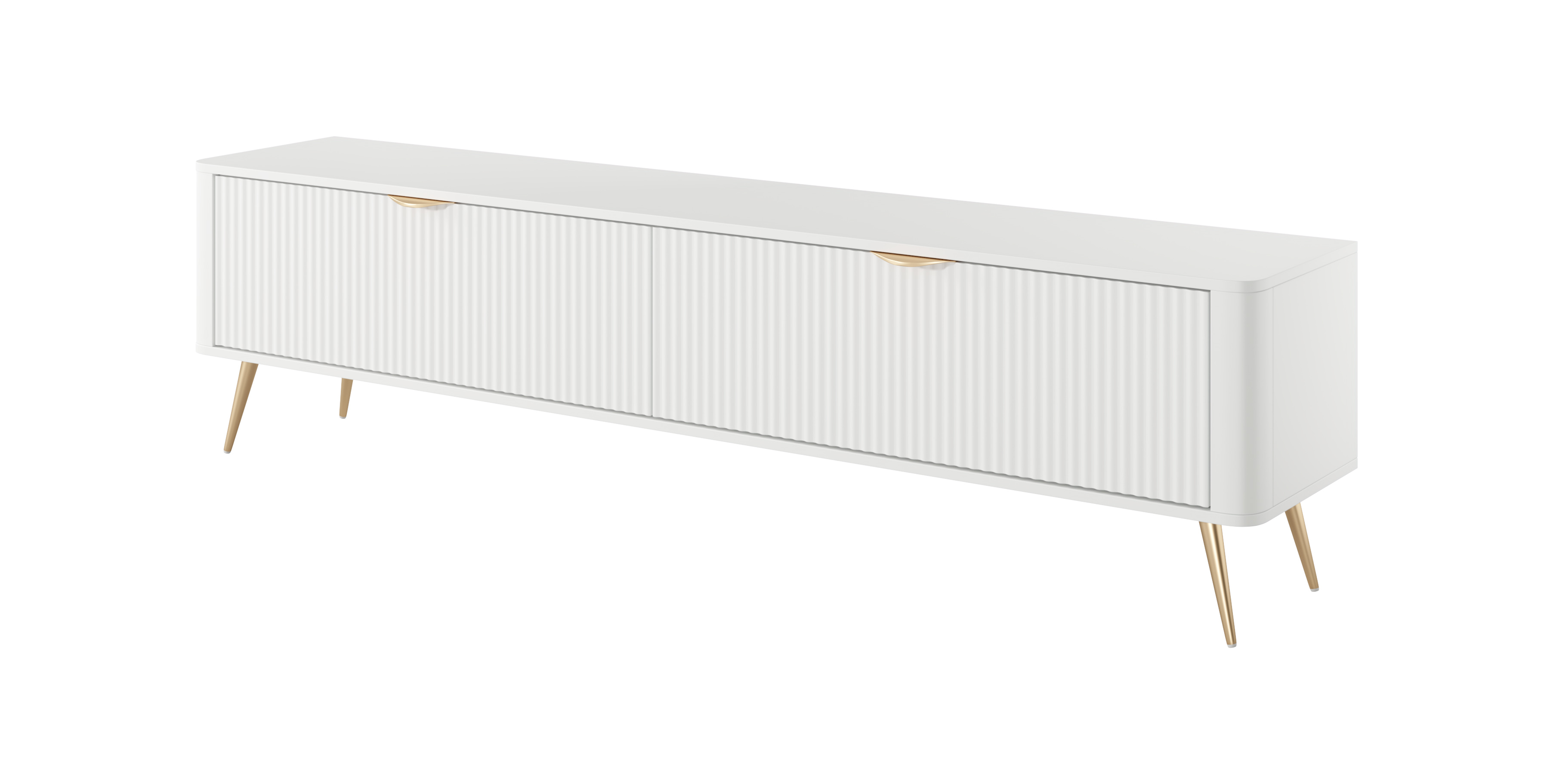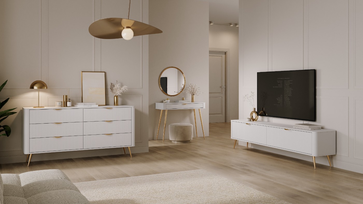 Charakterystyczne dla tej serii są ryflowane fronty, zaokrąglone krawędzie oraz złote akcenty, które nadają meblom wyjątkowego charakteru.