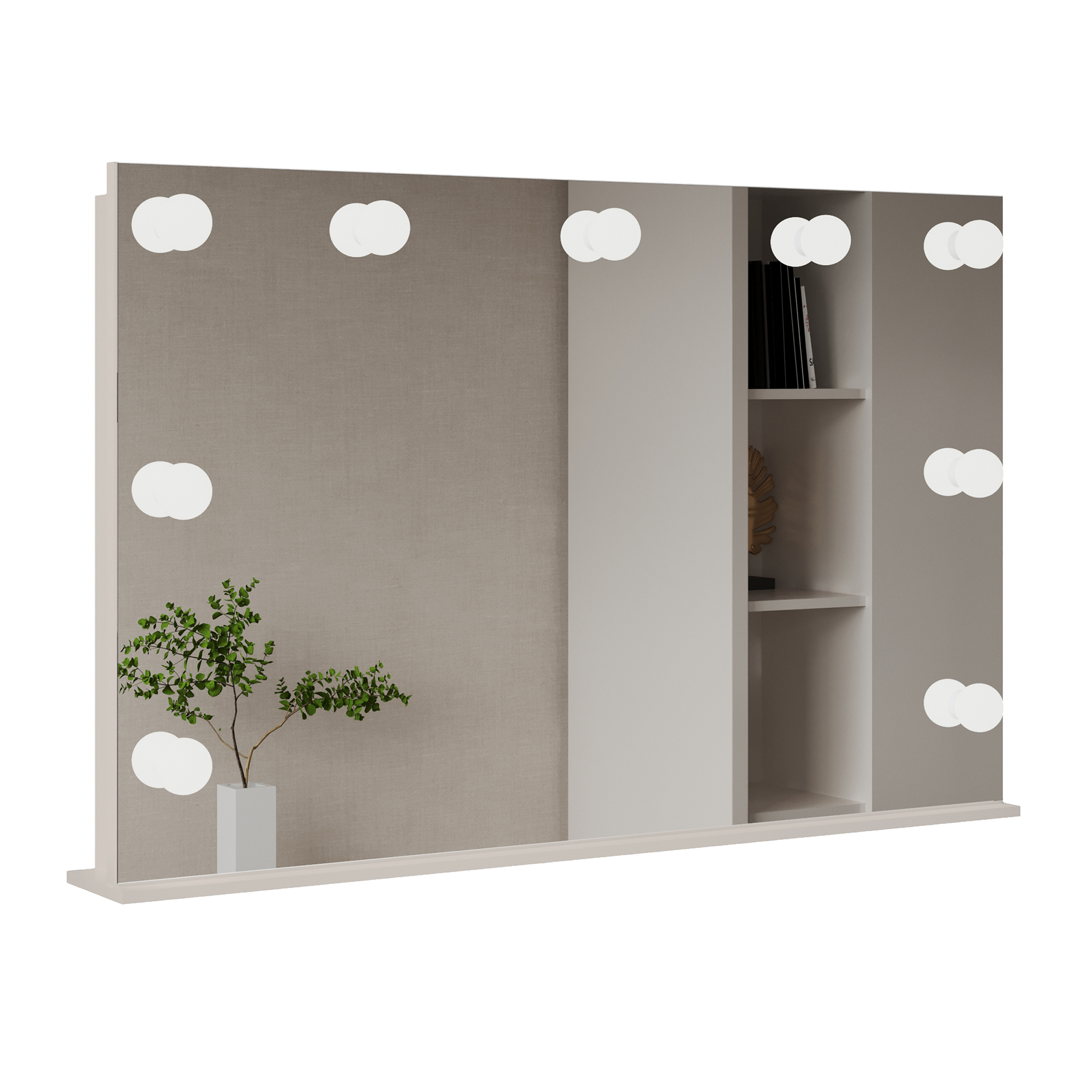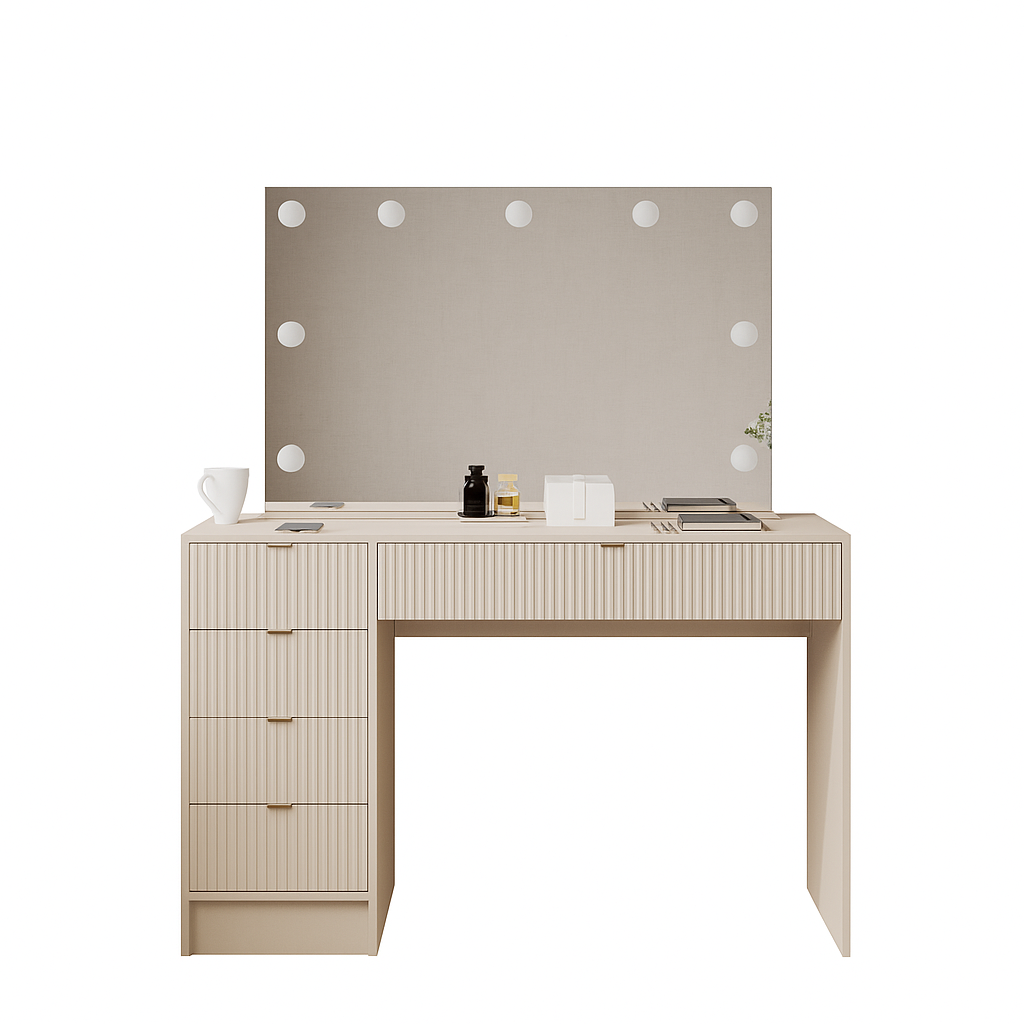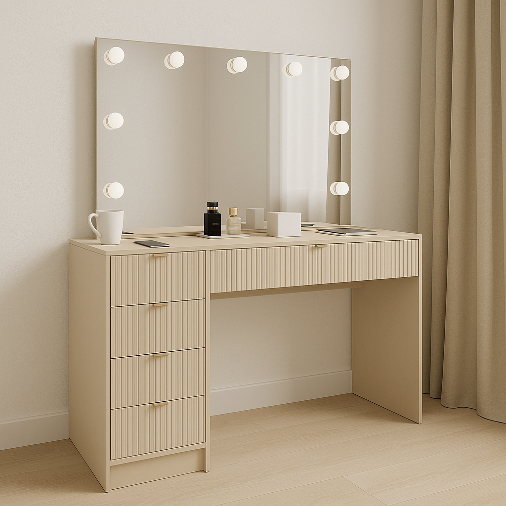 Elegancka i stylowa toaletka w kolorze kaszmir to idealny wybór dla osób ceniących ponadczasowy design z nutą nowoczesnego luksusu. Fronty szuflad zdobi delikatne frezowanie, które nadaje meblowi subtelny, dekoracyjny charakter, jednocześnie zachowując jego uniwersalny wygląd.