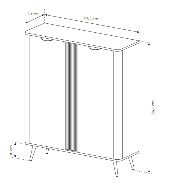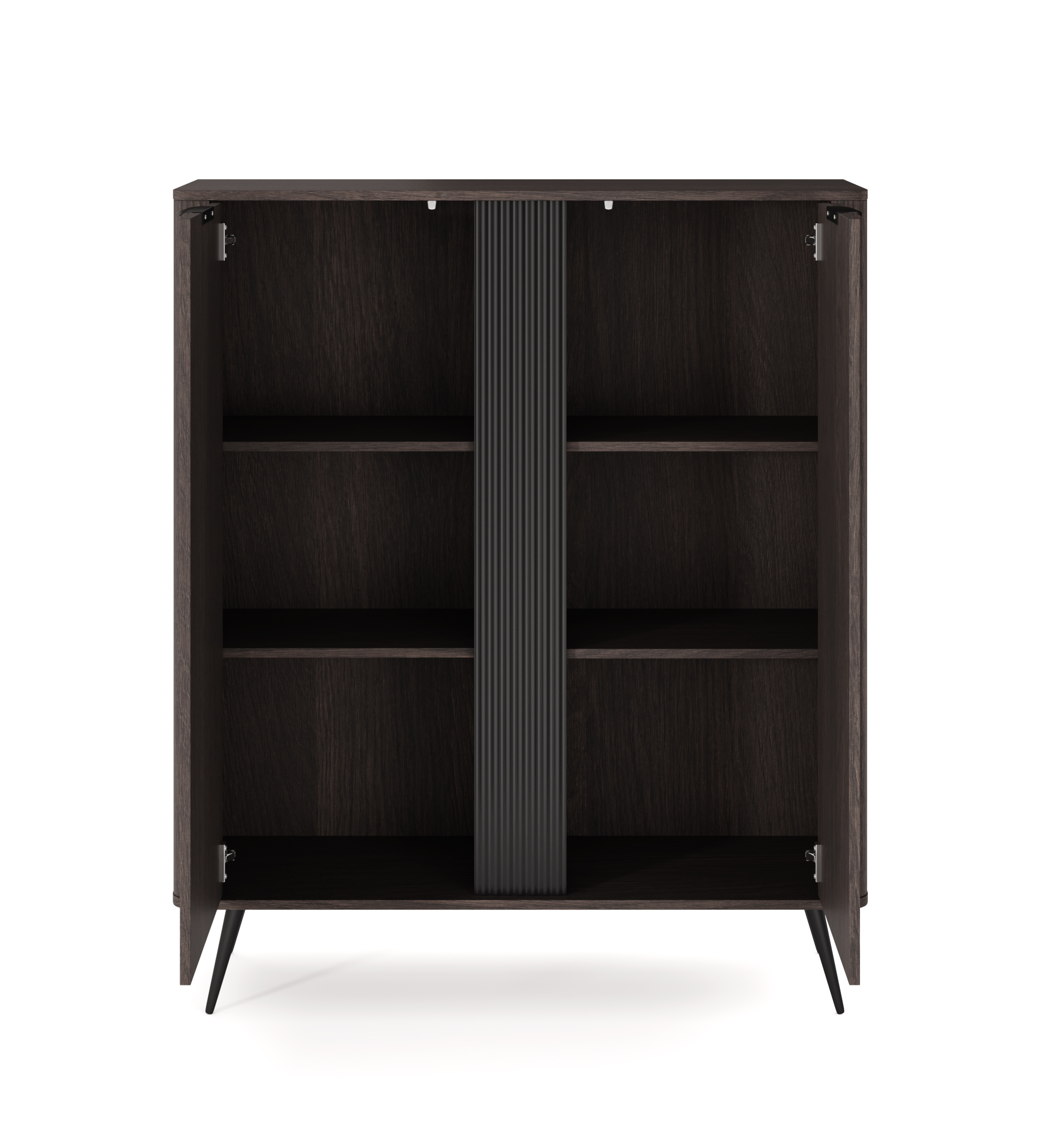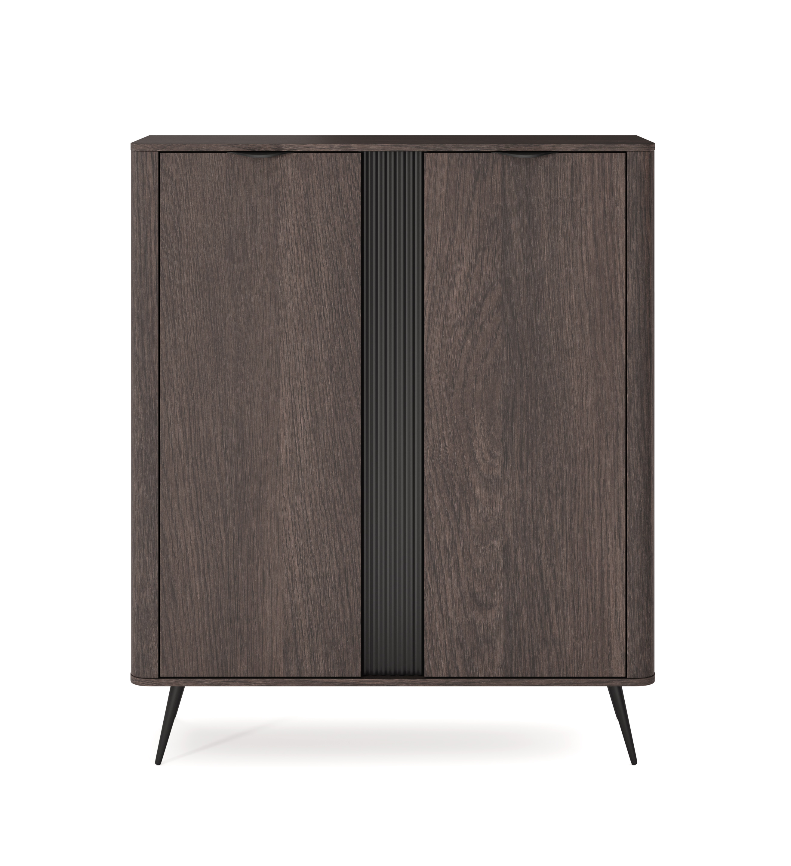 Charakterystyczne dla tej serii są zaokrąglone listwy na bokach oraz czarne akcenty, które nadają meblom wyjątkowego charakteru.